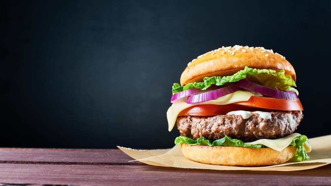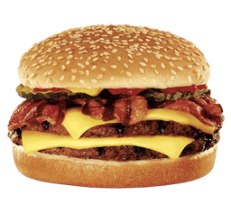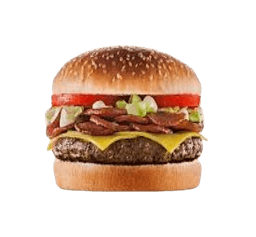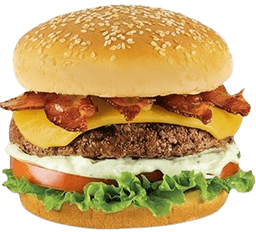 Pão, bife de picanha, bacon, queijo, alface, tomate, batata palha e milho verde.