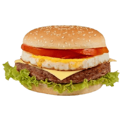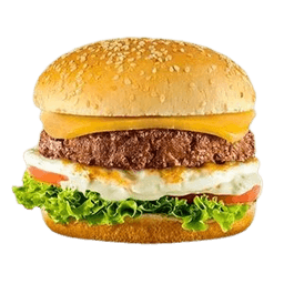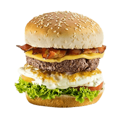 Pão, bife de picanha, bacon, ovo, queijo, alface, tomate, batata palha e milho verde.